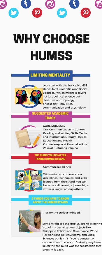 HUMSS stands for Humanities and Social Sciences. It is one of the strands offered to Senior High students. This strand is for learners who aim to take up journalism, communication arts, liberal arts, education, and other social science-related courses in college.